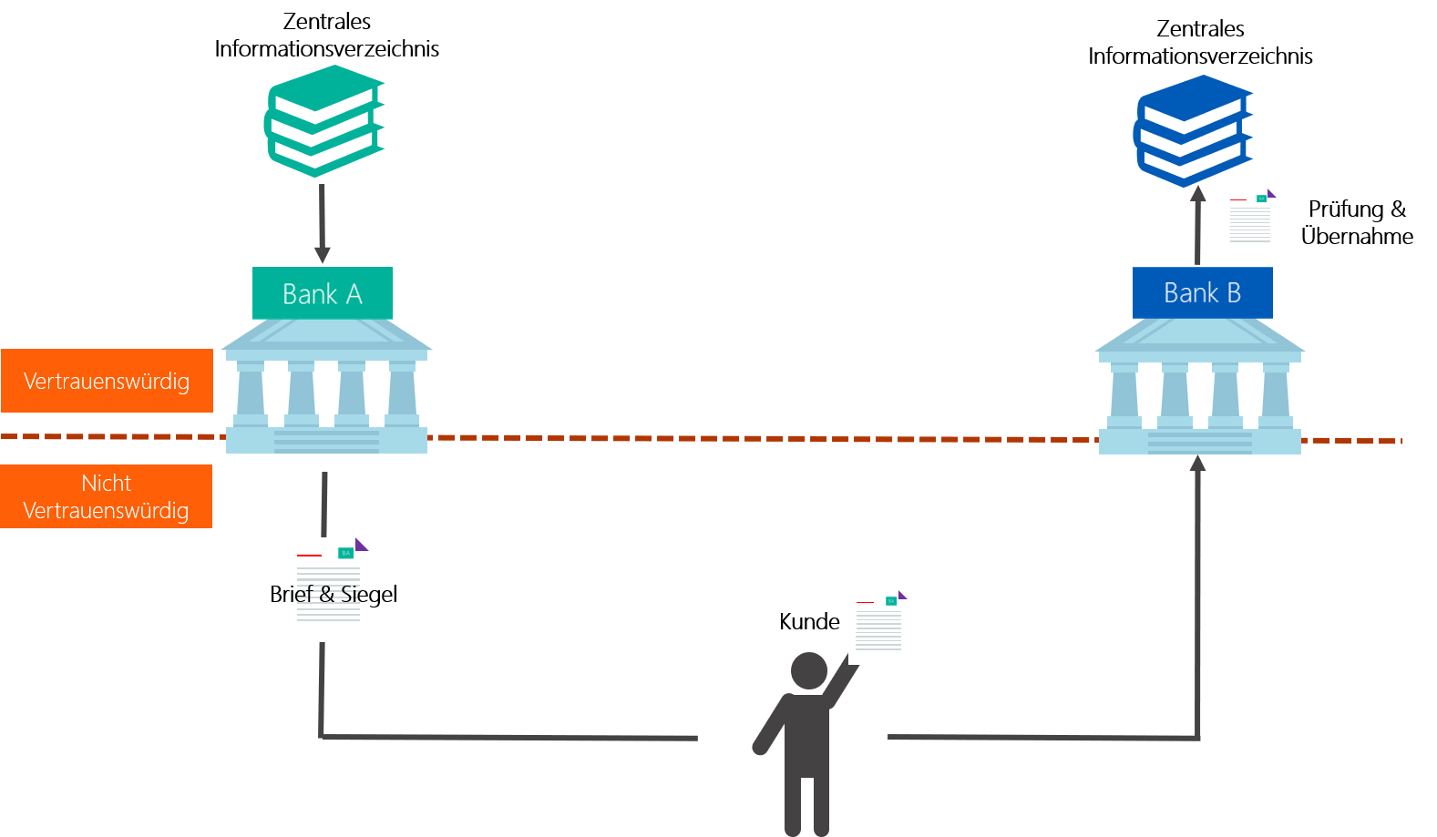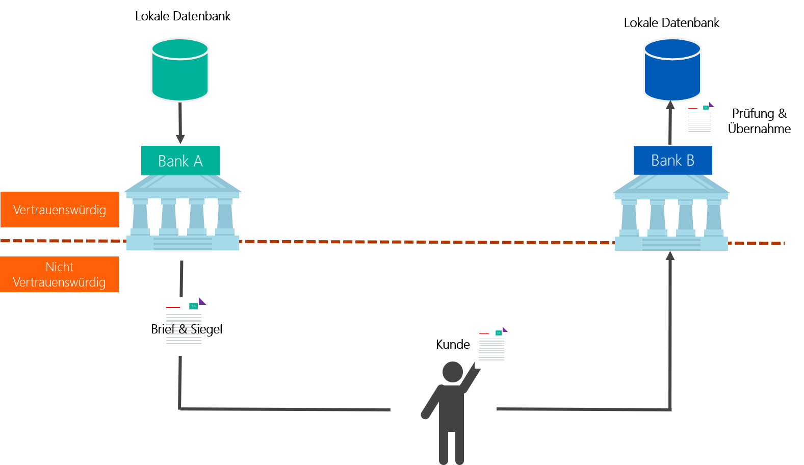 Die bürokratischen Prozesse zu einem bestimmten Vorgang basieren im Wesentlichen auf der Tatsache, dass Informationen, die an einem bestimmten physischen Ort, z.B. bei einer Bank A gespeichert sind und an einem anderen physischen Ort, z.B. einer Bank B, benötigt werden, damit die Bank B eine bestimmte Aktion für einen Kunden ausführen kann. Damit der Kunde von der Bank B bekommt, was er benötigt, muss er zu Bank A gehen, sich die Information mit ‚Brief und Siegel‘ bestätigen lassen und anschließend der Bank B zur Verfügung stellen. Die Bank B prüft bei Erhalt der Information deren Siegel, um die Authentizität des Ausstellers zu verifizieren.