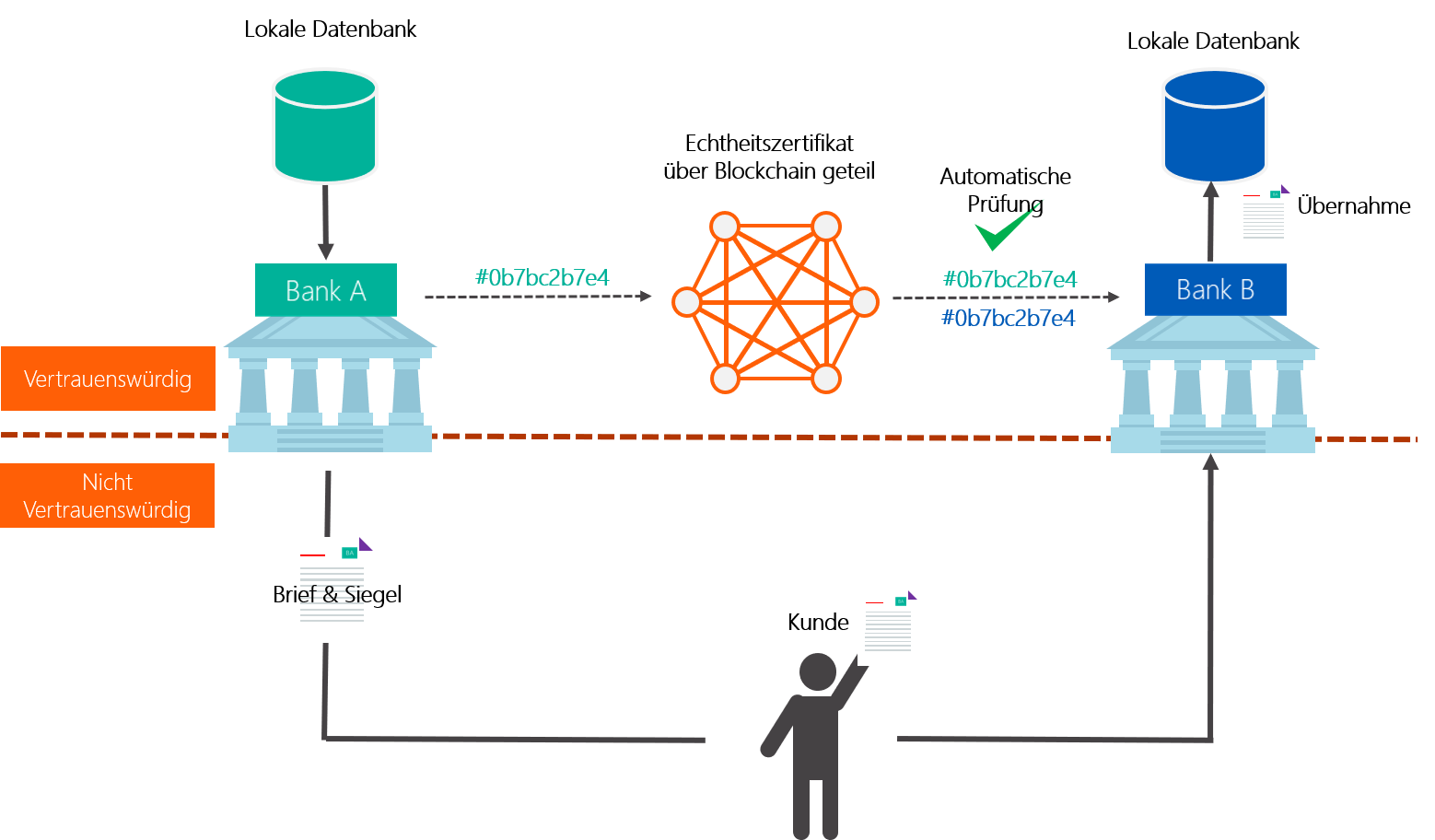 Die Bank B prüft den vom Kunden erhaltenen Datensatz. Dazu errechnet sie lediglich den Hash des übermittelten Datensatzes, vergleicht ob das mitgelieferte Zertifikat in der Blockchain vorhanden ist und ob die Hashes übereinstimmen. Bei Übereinstimmung sind die Informationen vertrauenswürdig.
