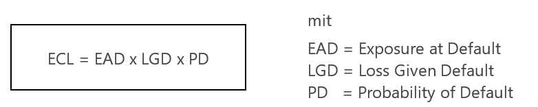 Der erwartete Kreditverlust (Expected Credit Loss, ECL) ermittelt sich aus der Kredithöhe zum Ausfallzeitpunkt (Exposure at Default), der Verlustquote (Loss Given Default) und der Ausfallwahrscheinlichkeit (Probability of Default). Er kann zum jeweils aktuellen Zeitpunkt wie folgt berechnet werden: