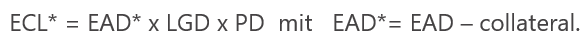 Das Exposure at Default kann hierbei entweder als Rohwert eingehen oder um den als Collateral hinterlegten Betrag korrigiert werden. Der Expected Credit Loss unter Berücksichtigung vorhandener Collaterals (ECL*) berechnet sich in diesem Beispiel gemäß