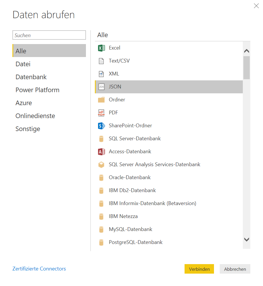 Um die verschiedenen Formate zu laden, bietet MS Power BI vordefinierte Importfunktionen für eine Palette an Formaten und Datenquellen an, die sogenannten Connectors (vgl. Abb. 2).