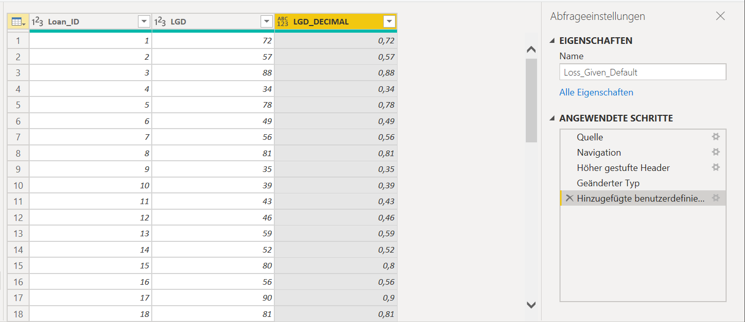 Abbildung 6: Die eingeladenen Daten des Loss Given Default werden in Dezimalzahlen umgewandelt und in einer zusätzlichen, benutzerdefinierten Spalte abgelegt. Quelle: MS PowerBI.