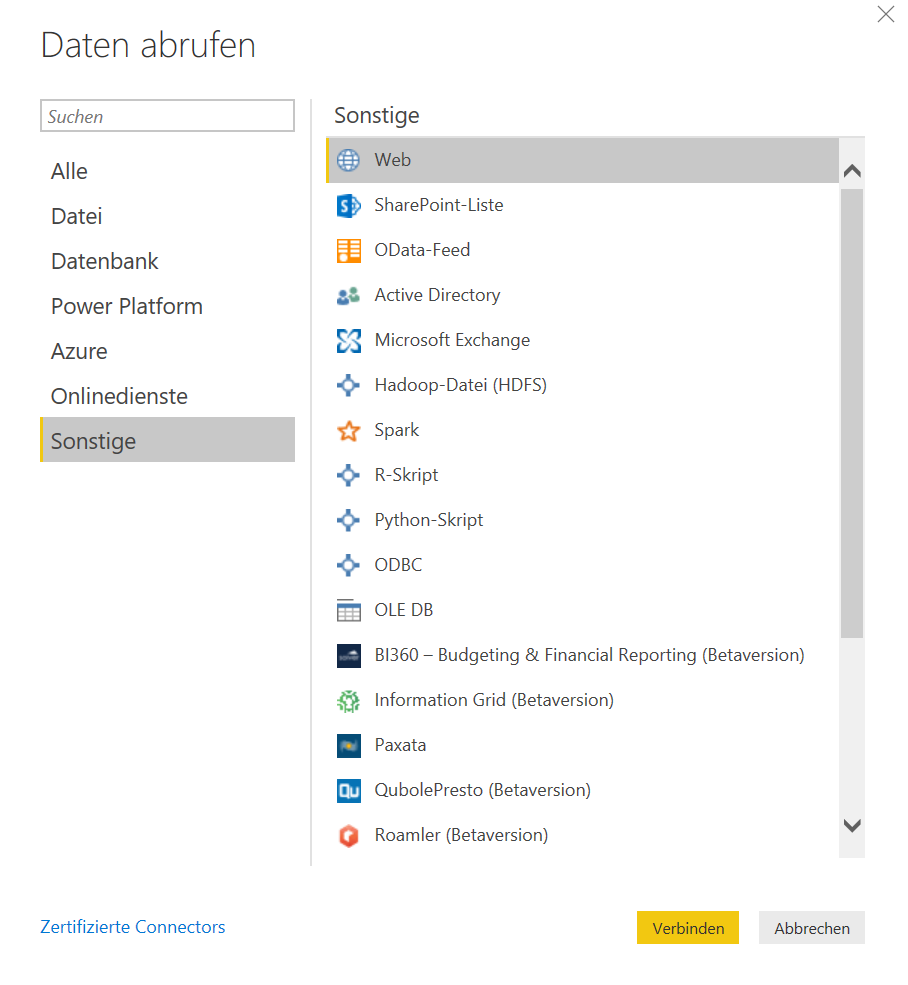 Abbildung 7: Power BI Menü um Daten aus externen Webquellen abzurufen. Quelle: MS PowerBI.