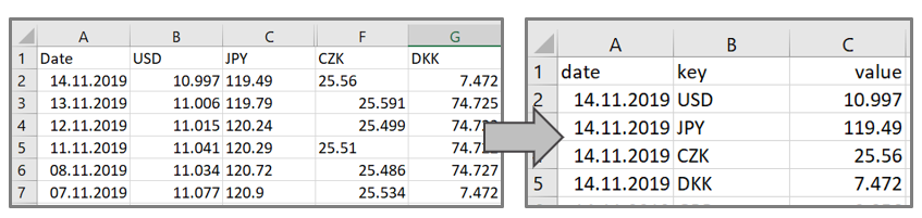 Abbildung 8: Links: Auszug aus der .CSV Datei der historischen Wechselkurse der EZB, abgerufen am 14.11.2019. Rechts: Transformierte Wechselkursdaten auf Basis der EZB-Quelldaten. Die Transformation erleichtert die Verknüpfung der Wechselkurse mit den übrigen Geschäftsdaten.