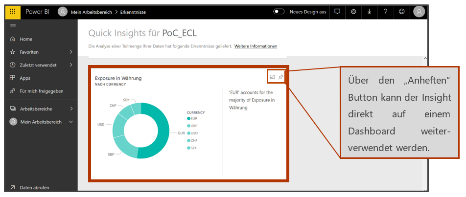 Abbildung 22: Möchte man einen Quick Insight weiterverwenden, gibt es die Möglichkeit diesen an ein vorhandenes Dashboard anzuheften oder ein neues Dashboard zu erstellen. Quelle: MS PowerBI.