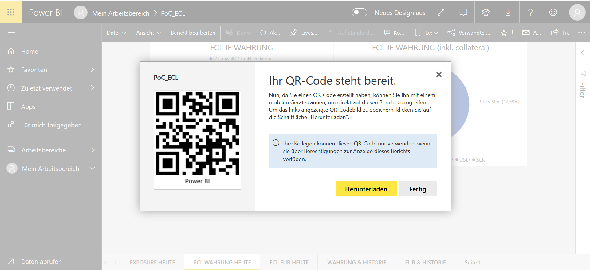 Abbildung 26: Das Generieren und Versenden eines QR-Codes erleichtert den Abruf des erstellten Dashboards über mobile Endgeräte. Quelle: MS PowerBI.