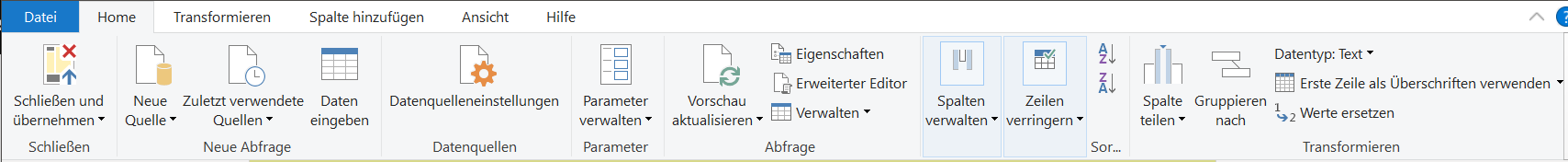 Abbildung 5: Der Power Query Editor bietet verschiedene Menüs zur Datentransformation an. Sind die Daten final bearbeitet, können die Änderungen ins Datenmodell übernommen und der Editor geschlossen werden. Quelle: MS PowerBI.
