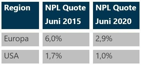 Europäische Banken haben in den letzten Jahren deutlich die Bestände an notleidenden Krediten (NPLs [1]) abgebaut. Tabelle 1 stellt dazu die Entwicklung im Vergleich mit den USA dar. Trotz der positiven Entwicklung bedarf es weiterer Fortschritte, um insbesondere vor dem Hintergrund der aktuellen Rezession die Zunahme abzumildern und nachhaltige negative Konsequenzen für die gesamtwirtschaftliche Kreditvergabe zu verhindern. Demzufolge haben sich die aufsichtsrechtlichen Erwartungen der Europäischen Bankaufsichtsbehörde (EBA) sowie der Europäischen Zentralbank (EZB) in Bezug auf die Anerkennung und den Umgang notleidender Kredite entwickelt oder erheblich verschärft.