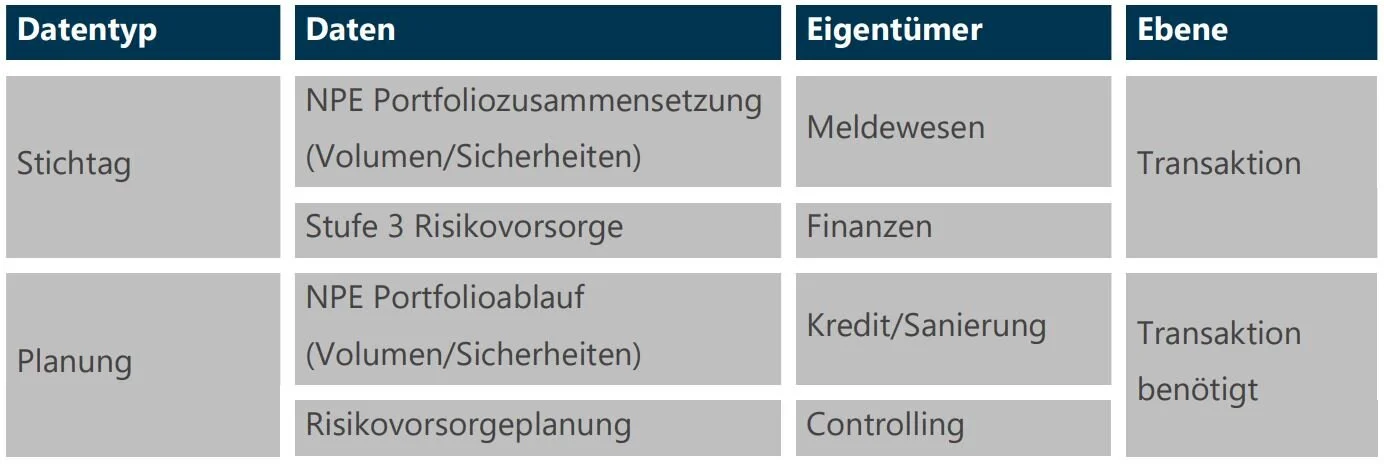 Die Ermittlung von möglichen Kapitalabzügen aus dem NPE Backstop über einen relevanten Planungshorizont ist schwierig aufgrund der unterschiedlichen Datenquellen und -eigentümer, siehe Tabelle 2.