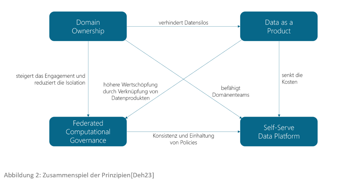 Domain Ownership: Die Verantwortung für die analytischen Daten wird dezentralisiert auf die fachlichen Domänen übertragen, die am besten mit den Daten vertraut sind. Dies können entweder die Datenquellen oder die Datenabnehmer sein. Die Daten werden logisch je Domäne aufgeteilt und unabhängig verwaltet. Jede Domäne wird durch ein funktionsübergreifendes Domänenteam, bestehend aus Fach- und IT-Experten, eigenständig in Form eines unabhängigen IT-Systems umgesetzt. Hierdurch wird die Agilität gesteigert, da weniger teamübergreifende Abstimmungen notwendig sind. Außerdem wird die Datenqualität gesteigert, da die Datenherkunft, die Datenverarbeitung und die Datennutzung näher zusammenrücken.