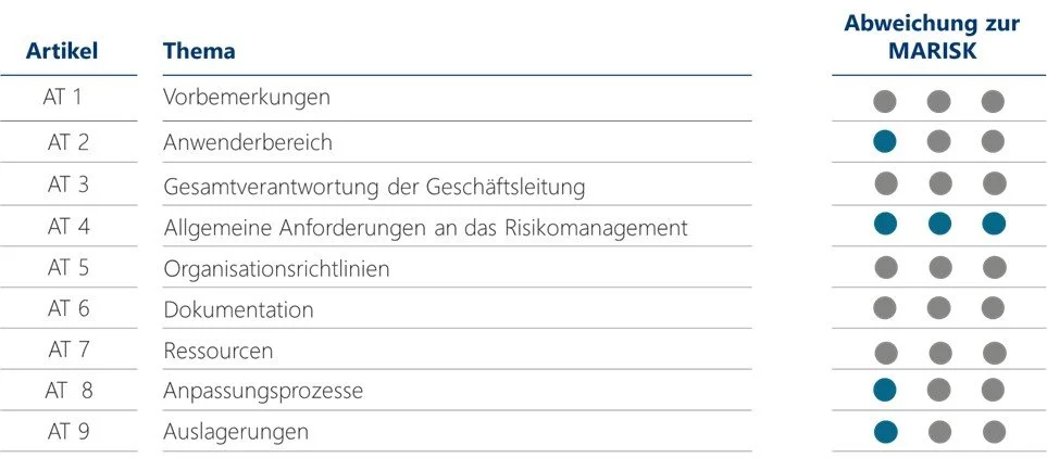 In der folgenden Abbildung geben wir einen kurzen Überblick über die relevanten Unterschiede und Gemeinsamkeiten zwischen dem besonderen Teil der MaRisk und dem Besondern Teil der ZAG-MaRisk. Graue Punkte geben dabei keine Abweichungen zur MaRisk wieder. Blaue Punkte stellen den Grad der Abweichung dar.