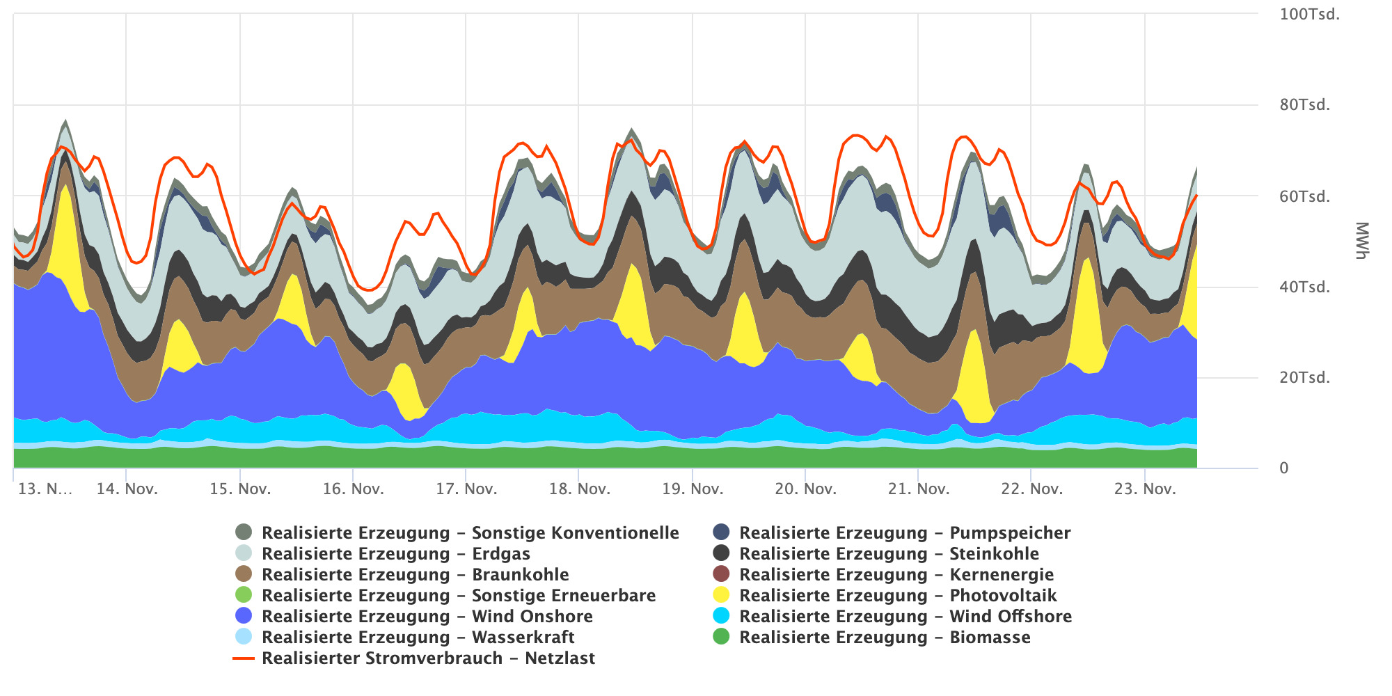 Abbildung 5 Deutsche Stromerzeugung und Netzlast vom 13.11.2025 bis 23.11.2025 (in [2] ausführlichere Darstellung)